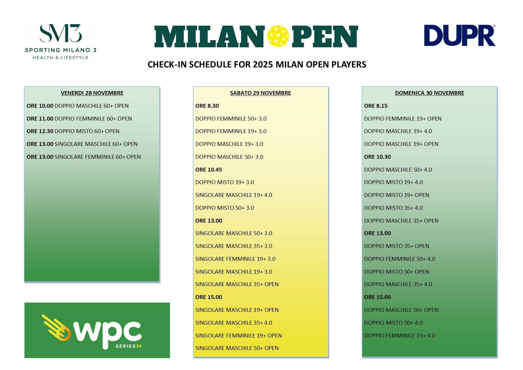 WELCOME TO MILANO OPEN, THE TOURNAMENT YOU CAN'T MISS! SECOND EDITION OF THE MILAN OPEN PICKLEBALL International tournament that will be played in the prestigious Sporting Milano 3, where for the occasion will be set up, in addition to the usual 4 fields, another 12 fields . For the Italian players it is necessary to be in possession of any FITP card, both competitive and non-competitive, and to have a valid medical certificate for non-competitive sports activity (or competitive). For Italian players: without a valid medical certificate it will not be possible to participate in the tournament. For non-Italian players, it will be necessary to fill out a statement of good health for eligibility to play, one week before the tournament, which will be available soon on this page. You can also register without a partner: in this case you will be matched by the organizers. Warning: it is possible to register only for a division between 19+ , 35+ and 50+ of the same specialty per day (e.g. you must choose between male single 19+ or 50+ you can not play both). The organizer, in case a minimum number of 4 participants/pairs per tournament is not reached, may cancel the same or group different age groups (+50 with +19) after acceptance by those interested. Players +50 are all players over 50 or those who will turn 50 in this calendar year: the condition , in case of a double, must be valid for both. When registering, you will have to pay the registration fee: 40 euros for the first tournament of the day, 10 euros for each subsequent division. The fee is non-refundable. RACE FIELD AND SCORING For the tournament we have 4 fixed fields and other covered fields marked with tape. There will also be support camps specially dedicated to the warm-up phase of the athletes: you must present yourself at the meeting ready to start the match. All players must always be available for tournaments: after a delay of 10 minutes from the call to the field will lose the table. All divisions, with a higher number of 5 pairs or players registered, provide for an Italian group stage and a subsequent elimination table. The first two teams in each group will qualify for the second round. If the group is unique, all will play against all without final phase. When possible, consolation matches for non-qualifiers will also be organized. Each match will be self-arbitrated, of one set only, and will end at 11 with the win by one rule in case of 10-even score. Only the 1-2 and 3-4 final will be played at 15, always with the win by one rule in case of 14 pairs. Awards The top three in each division will be awarded at the end of each specialty. Prizes will be drawn from the sponsors' prize draw among participants during the event.